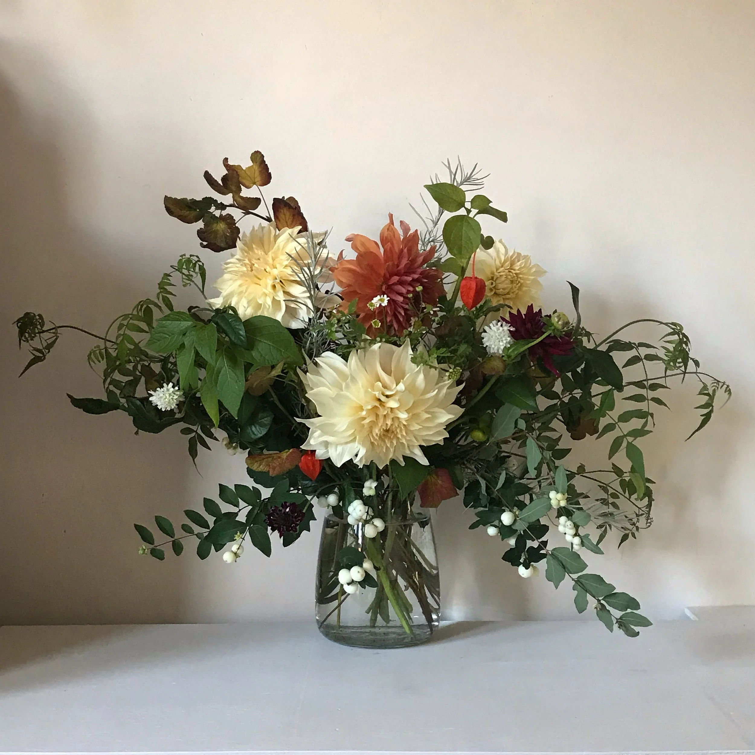 Gorgeous bouquets of British flowers delivered monthly, bi-weekly or weekly. Designs differ every week emphasising the true nature of seasonality. Delivered in a return and reuse glass vase which we collect when arriving with your new flowers.